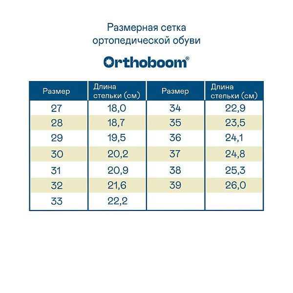 Фирменная съемная стелька Orthoboom. Разработана специально для детской обуви. Имеет наружнюю и внутреннюю выкладку продольного свода для правильного формирования стоп. Углубление под пятку предотвращает заваливание стоп.