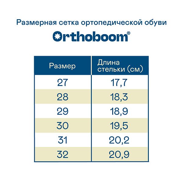 Фирменная съемная стелька Orthoboom. Разработана специально для детской обуви. Имеет наружнюю и внутреннюю выкладку продольного свода для правильного формирования стоп. Углубление под пятку предотвращает заваливание стоп.