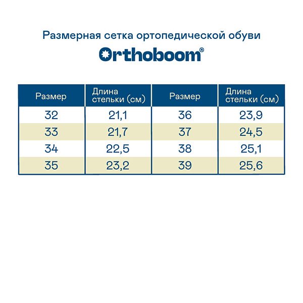 Фирменная съемная стелька Orthoboom. Разработана специально для детской обуви. Имеет наружнюю и внутреннюю выкладку продольного свода для правильного формирования стоп. Углубление под пятку предотвращает заваливание стоп.