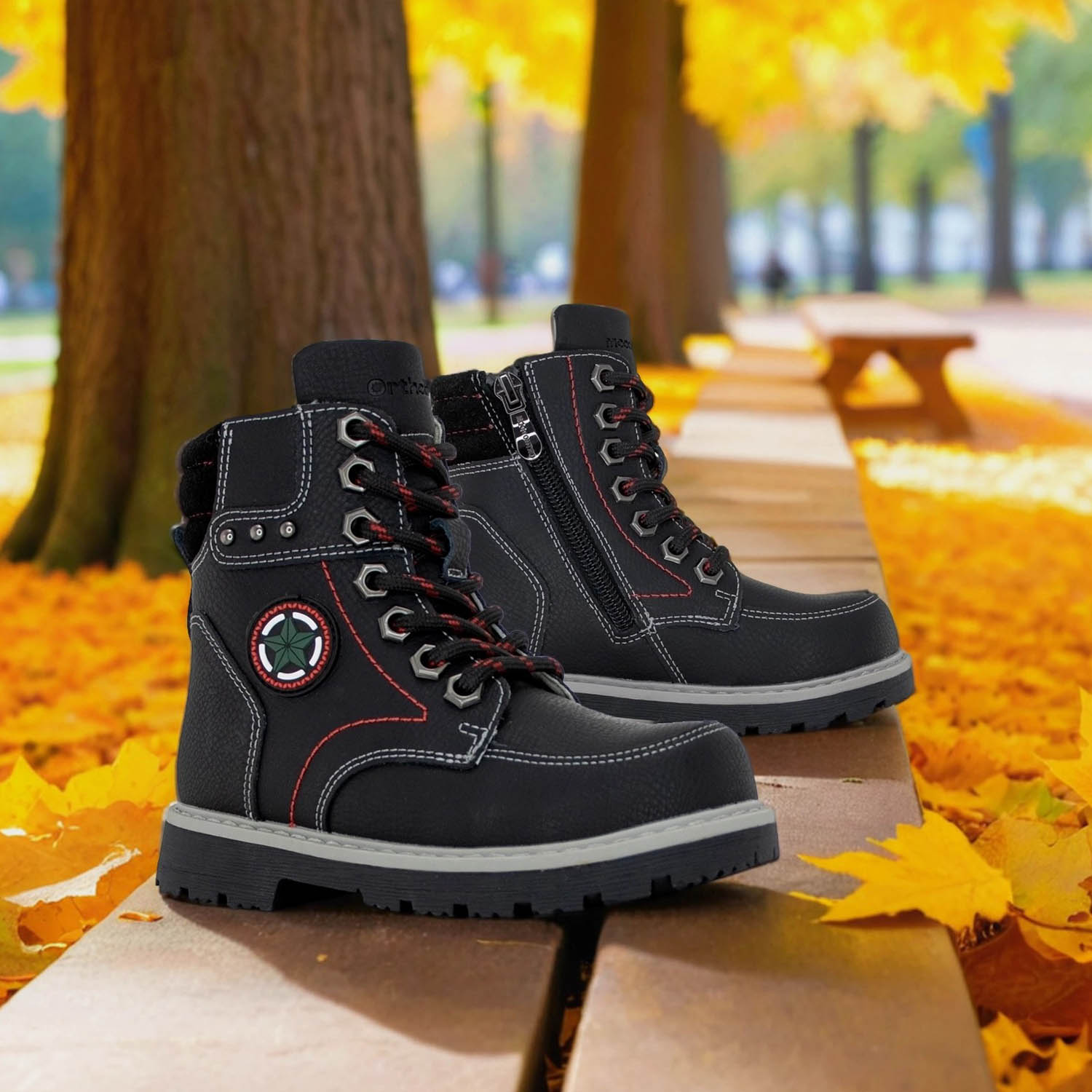 Кожа для производства обуви Orthoboom подбирается с учетом гигроскопичности и эко-стандарта, в том числе в производстве используется натуральная итальянская кожа высшего качества, нубук, замша и текстиль.