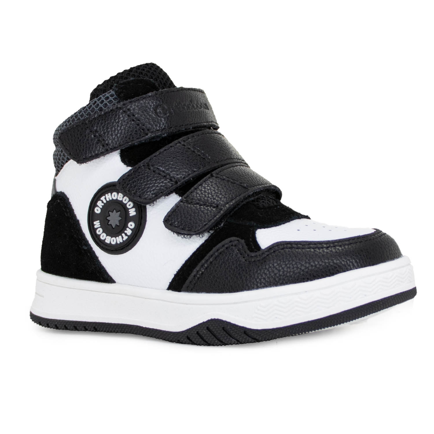 За счет широкой раскрываемости и удобной застежки обувь легко снимать и надевать, а нескользящая подошва снижает риск поскользнуться на любых типах поверхности. Ортопедические осенние детские ботинки Orthoboom 80123-01 черно-белая симфония прошли клинические испытания, модель сертифицирована для безопасного использования в детском возрасте.