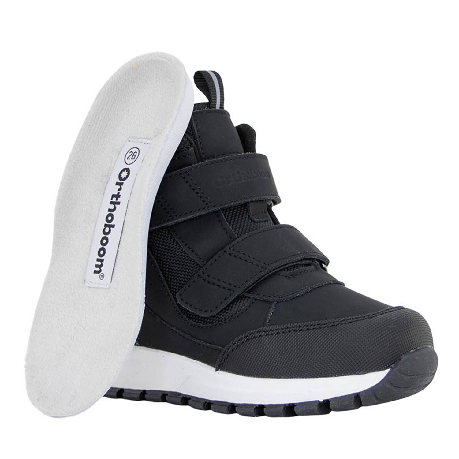 Фирменная съемная стелька Orthoboom. Разработана специально для детской обуви. Имеет наружнюю и внутреннюю выкладку продольного свода для правильного формирования стоп. Углубление под пятку предотвращает заваливание стоп.