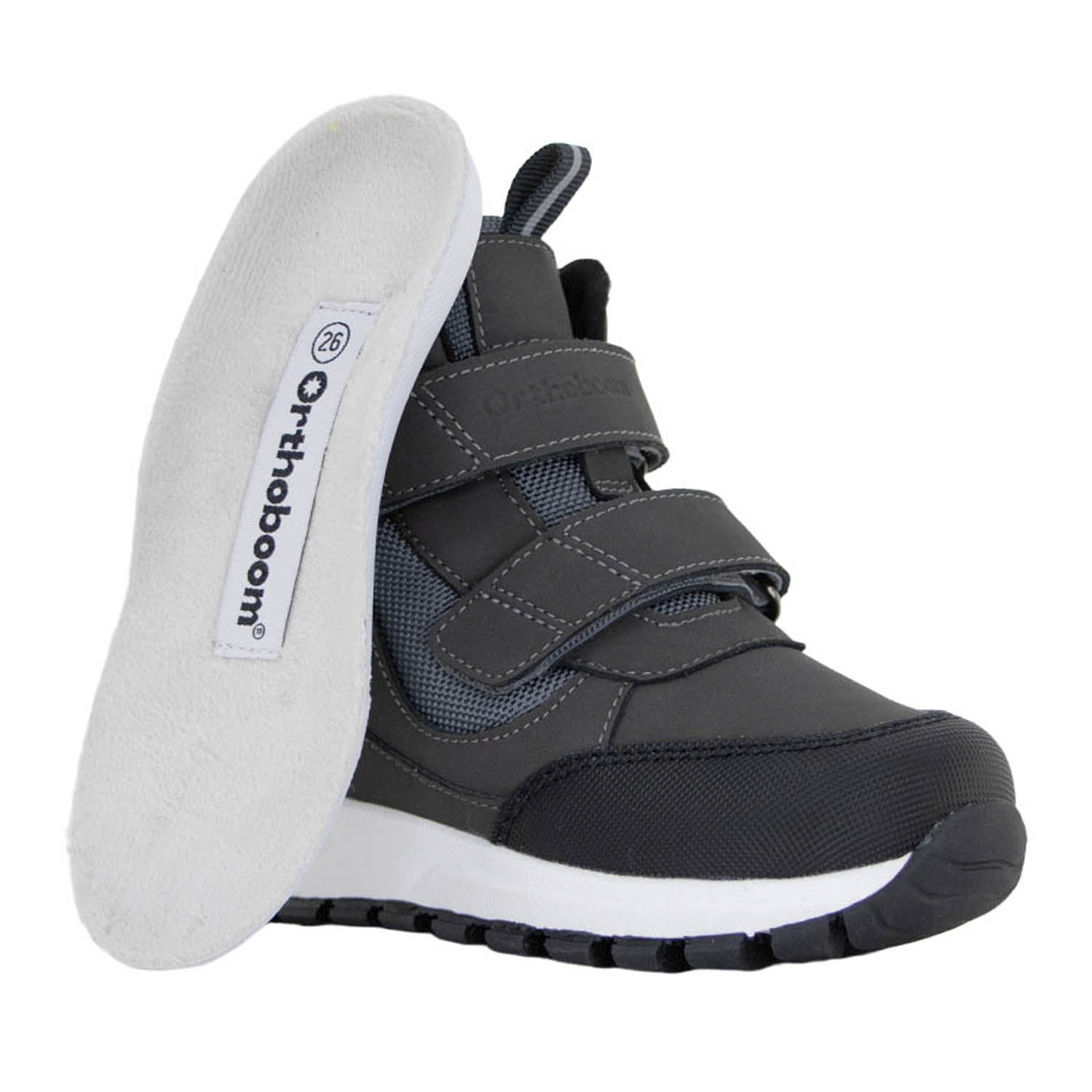 Фирменная съемная стелька Orthoboom. Разработана специально для детской обуви. Имеет наружнюю и внутреннюю выкладку продольного свода для правильного формирования стоп. Углубление под пятку предотвращает заваливание стоп.