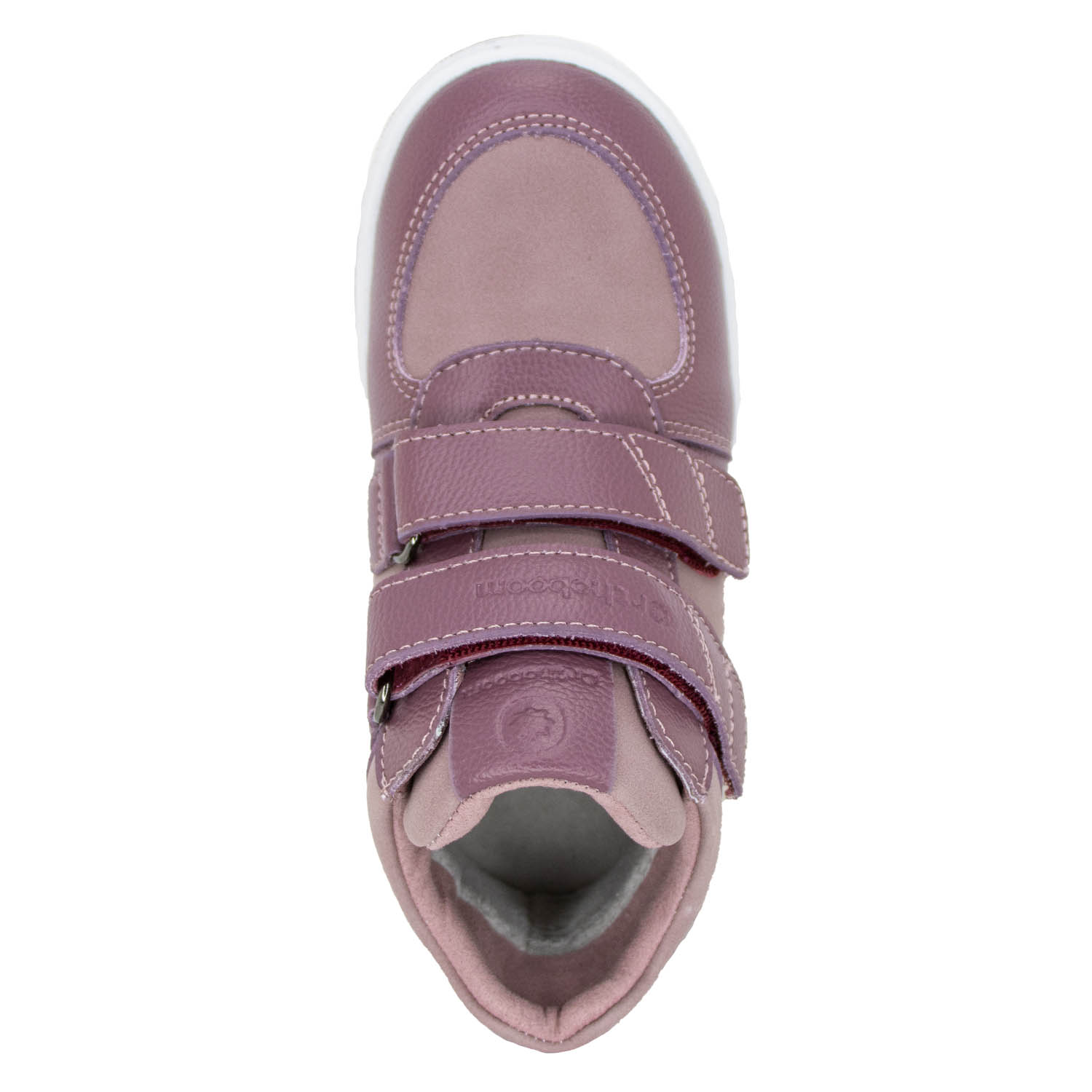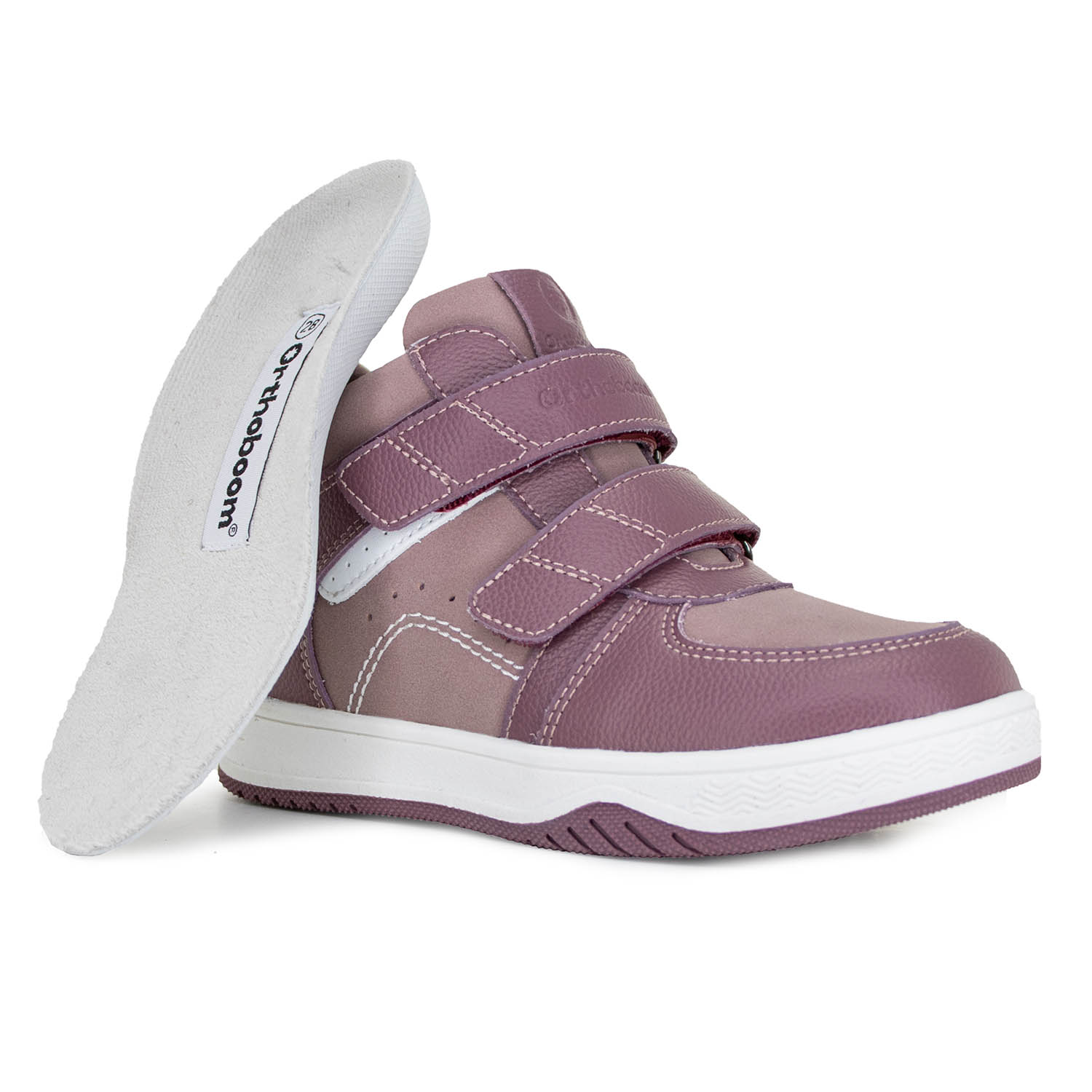 Фирменная съемная стелька Orthoboom. Разработана специально для детской обуви. Имеет наружнюю и внутреннюю выкладку продольного свода для правильного формирования стоп. Углубление под пятку предотвращает заваливание стоп.