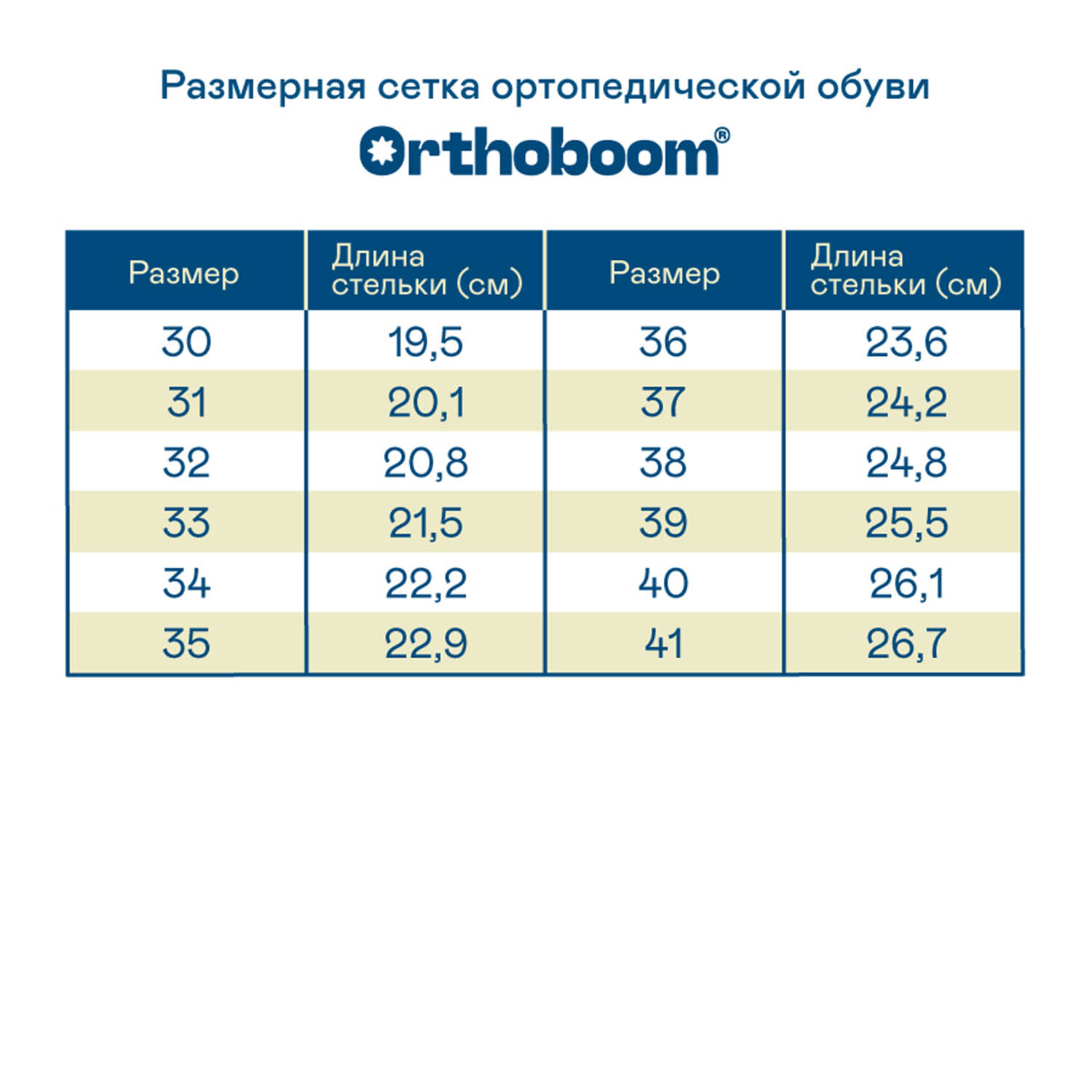Фирменная съемная стелька Orthoboom. Разработана специально для детской обуви. Имеет наружнюю и внутреннюю выкладку продольного свода для правильного формирования стоп. Углубление под пятку предотвращает заваливание стоп.