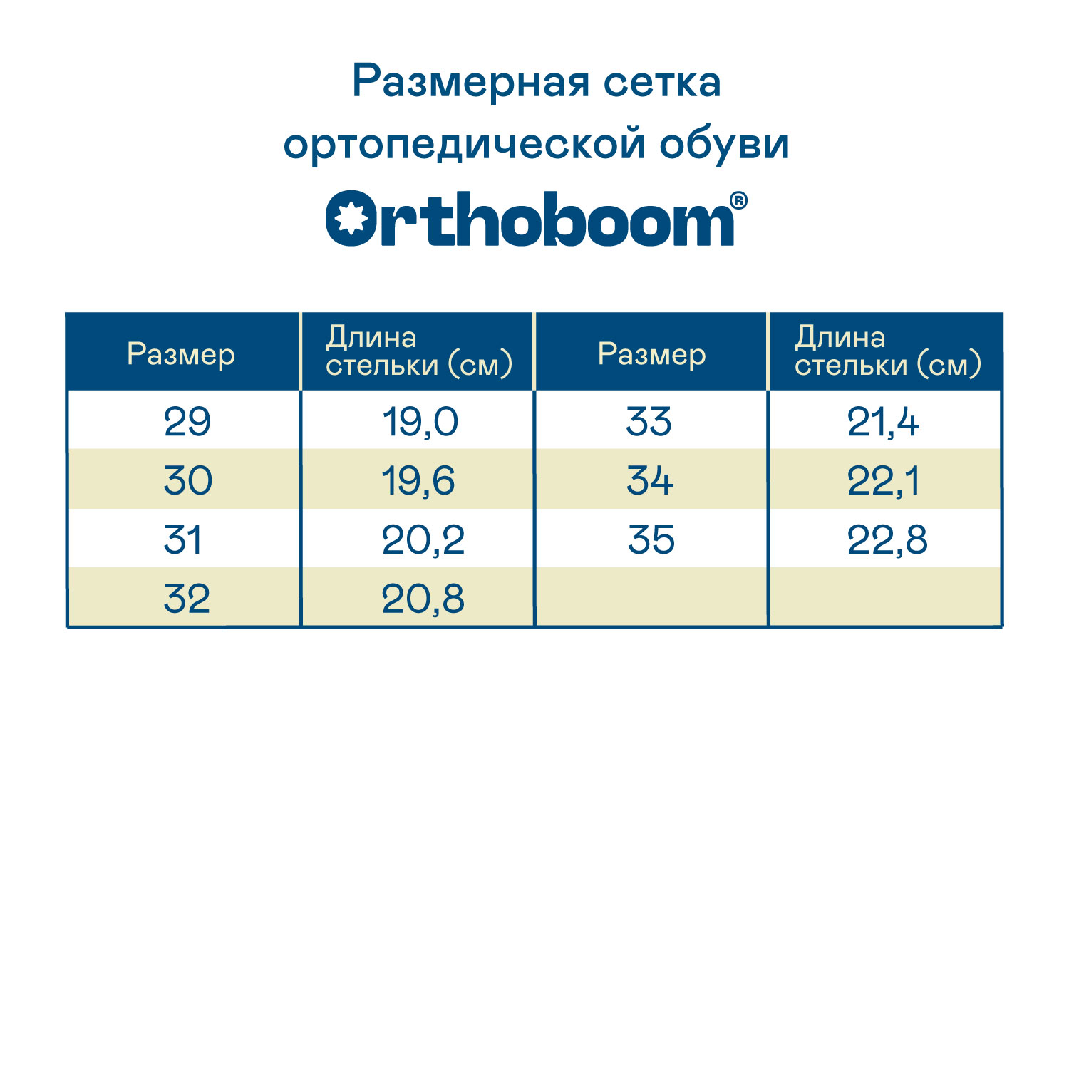 Фирменная съемная стелька Orthoboom. Разработана специально для детской обуви. Имеет наружнюю и внутреннюю выкладку продольного свода для правильного формирования стоп. Углубление под пятку предотвращает заваливание стоп.