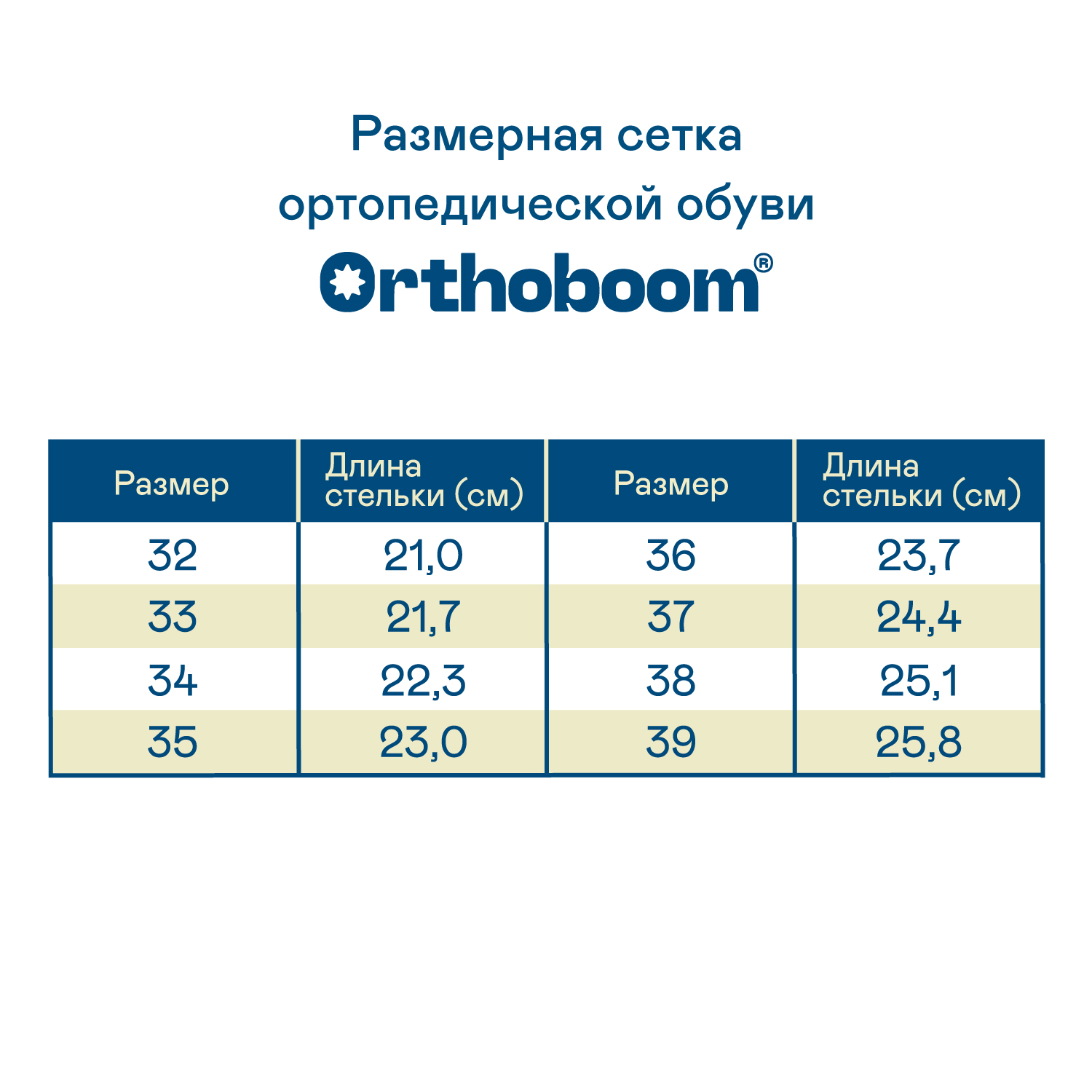 Фирменная съемная стелька Orthoboom. Разработана специально для детской обуви. Имеет наружнюю и внутреннюю выкладку продольного свода для правильного формирования стоп. Углубление под пятку предотвращает заваливание стоп.