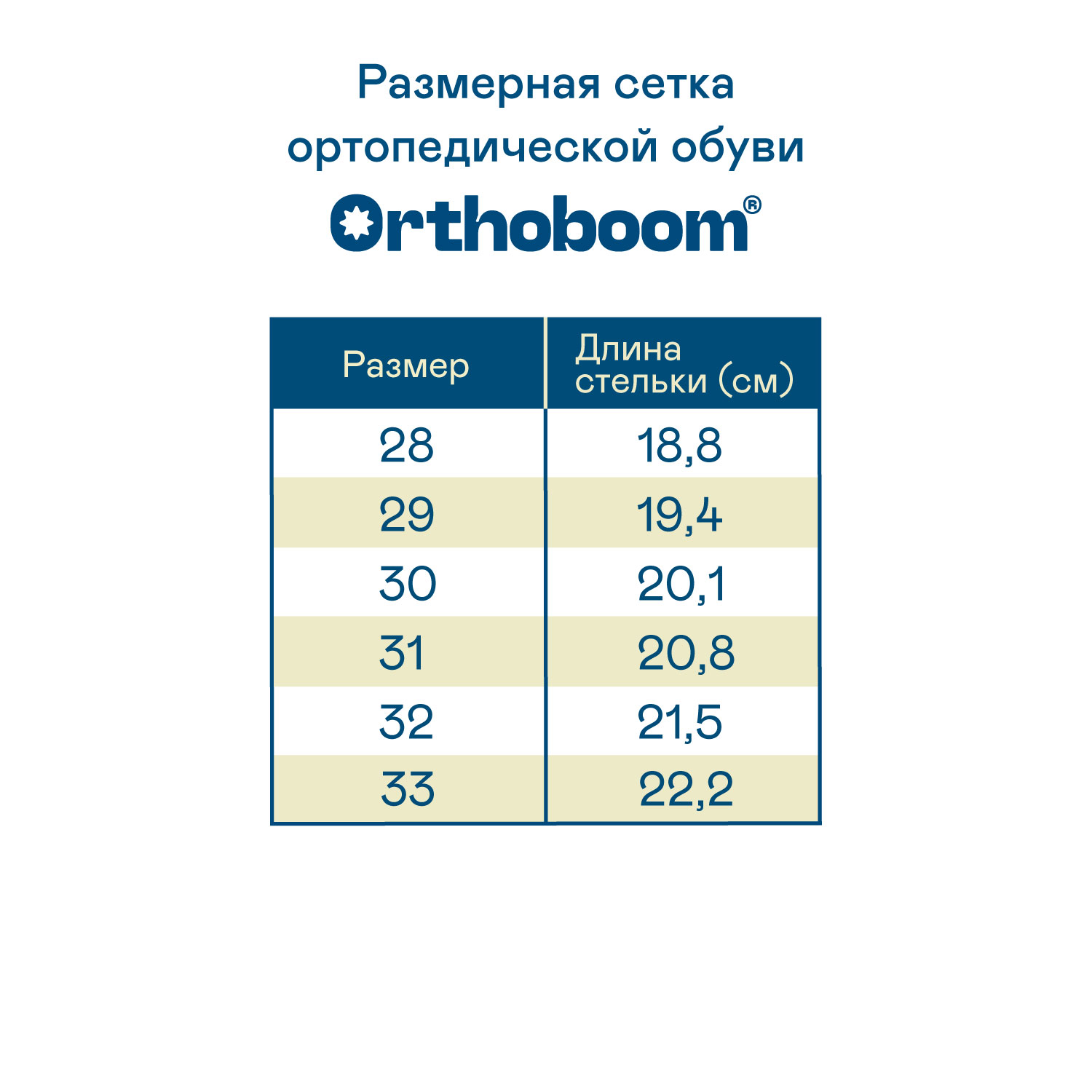 Фирменная съемная стелька Orthoboom. Разработана специально для детской обуви. Имеет наружнюю и внутреннюю выкладку продольного свода для правильного формирования стоп. Углубление под пятку предотвращает заваливание стоп.