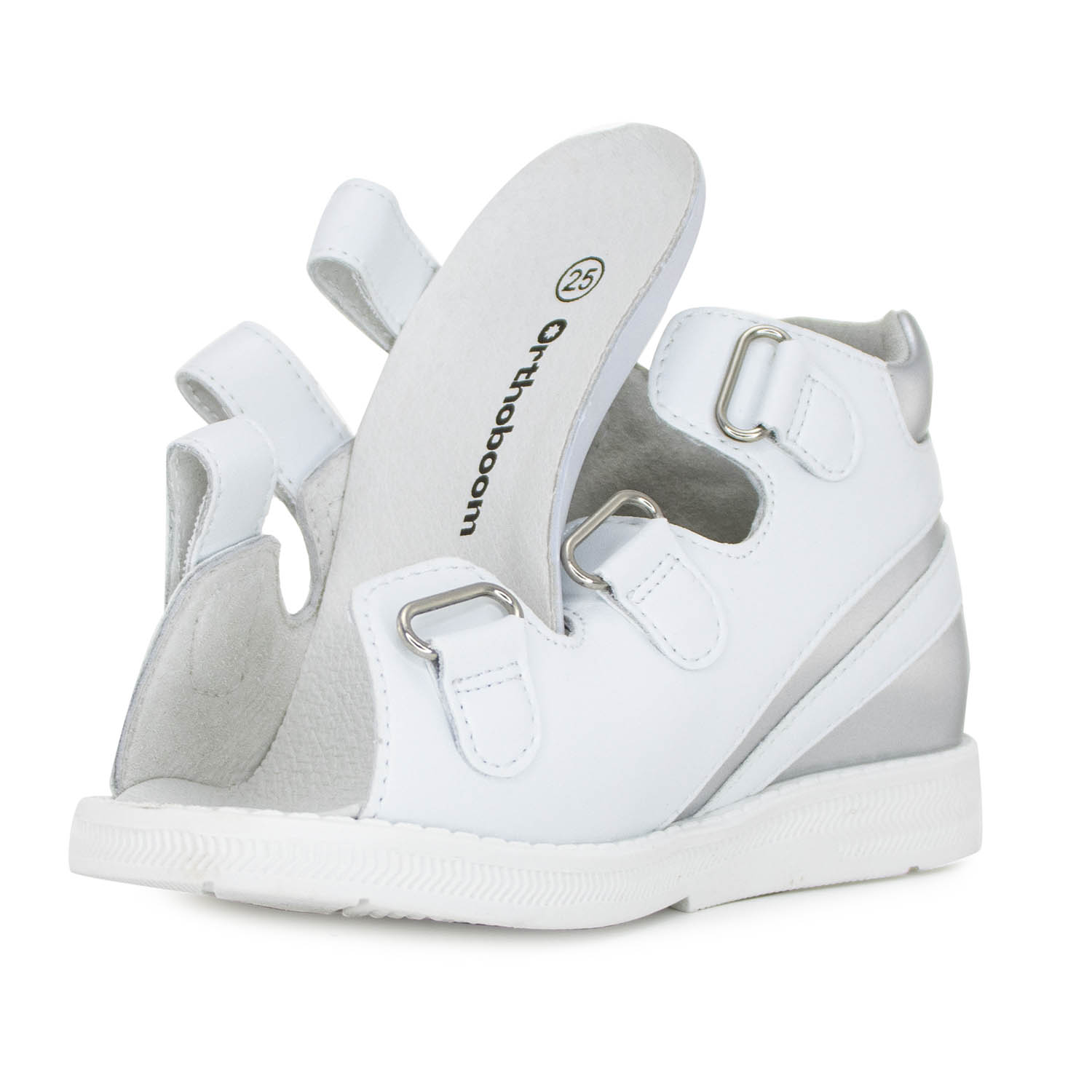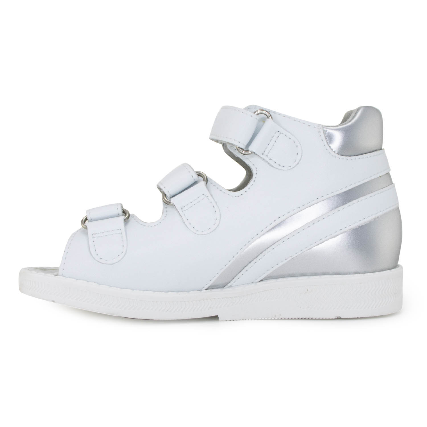 За счет широкой раскрываемости и удобной застежки обувь легко снимать и надевать, а нескользящая подошва снижает риск поскользнуться на любых типах поверхности. Ортопедические летние детские сандалии Orthoboom 43397-5 белый с серебром прошли клинические испытания, модель сертифицирована для безопасного использования в детском возрасте.