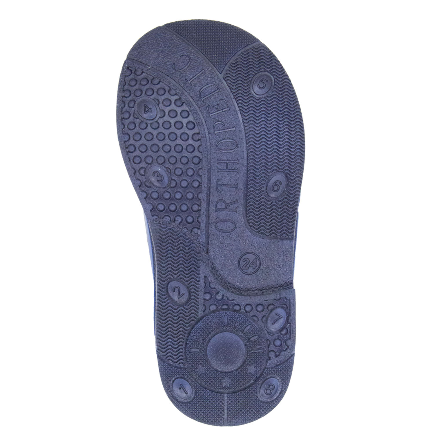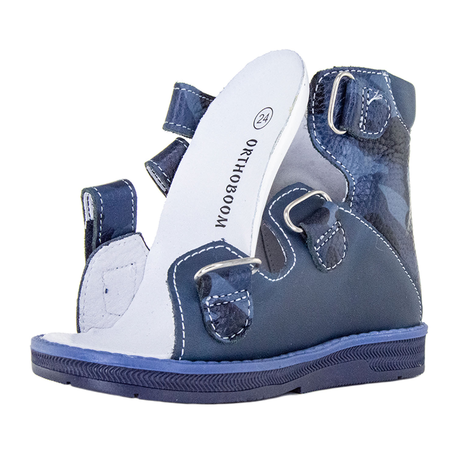 Фирменная съемная стелька Orthoboom. Разработана специально для детской обуви. Имеет наружнюю и внутреннюю выкладку продольного свода для правильного формирования стоп. Углубление под пятку предотвращает заваливание стоп.