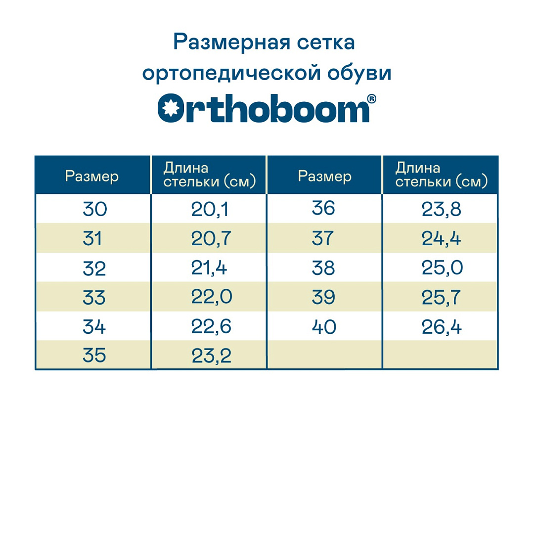 Фирменная съемная стелька Orthoboom. Разработана специально для детской обуви. Имеет наружнюю и внутреннюю выкладку продольного свода для правильного формирования стоп. Углубление под пятку предотвращает заваливание стоп.