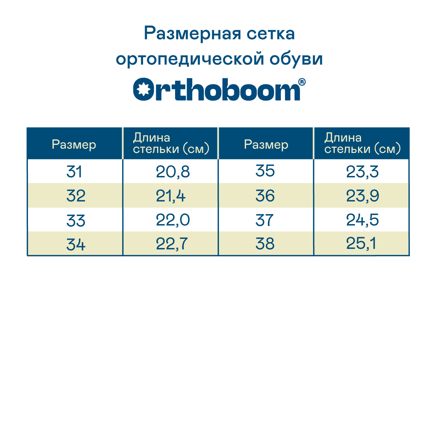 Фирменная съемная стелька Orthoboom. Разработана специально для детской обуви. Имеет наружнюю и внутреннюю выкладку продольного свода для правильного формирования стоп. Углубление под пятку предотвращает заваливание стоп.
