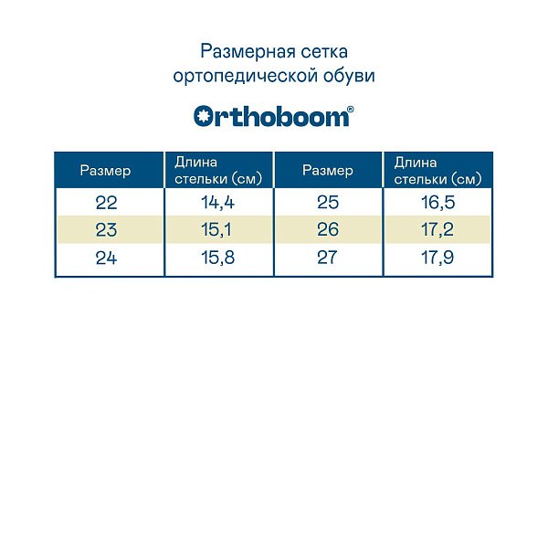 Фирменная съемная стелька Orthoboom. Разработана специально для детской обуви. Имеет наружнюю и внутреннюю выкладку продольного свода для правильного формирования стоп. Углубление под пятку предотвращает заваливание стоп.