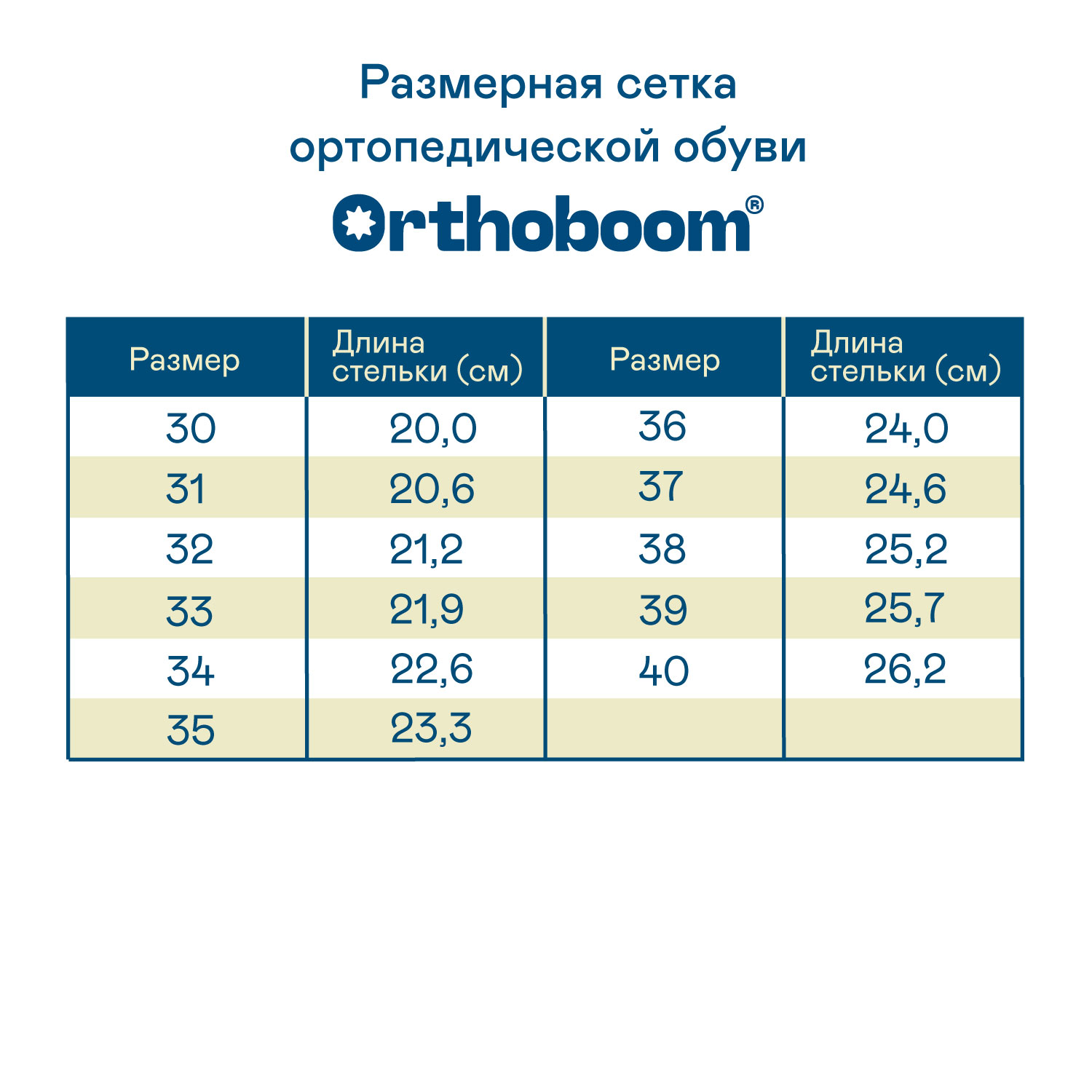 Фирменная съемная стелька Orthoboom. Разработана специально для детской обуви. Имеет наружнюю и внутреннюю выкладку продольного свода для правильного формирования стоп. Углубление под пятку предотвращает заваливание стоп.