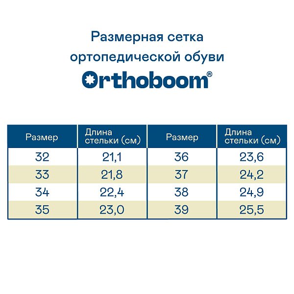 Фирменная съемная стелька Orthoboom. Разработана специально для детской обуви. Имеет наружнюю и внутреннюю выкладку продольного свода для правильного формирования стоп. Углубление под пятку предотвращает заваливание стоп.