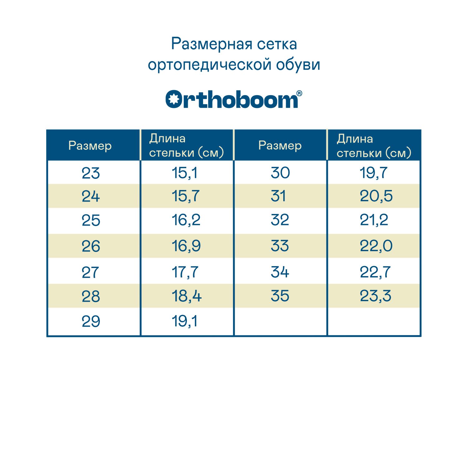 Фирменная съемная стелька Orthoboom. Разработана специально для детской обуви. Имеет наружнюю и внутреннюю выкладку продольного свода для правильного формирования стоп. Углубление под пятку предотвращает заваливание стоп.
